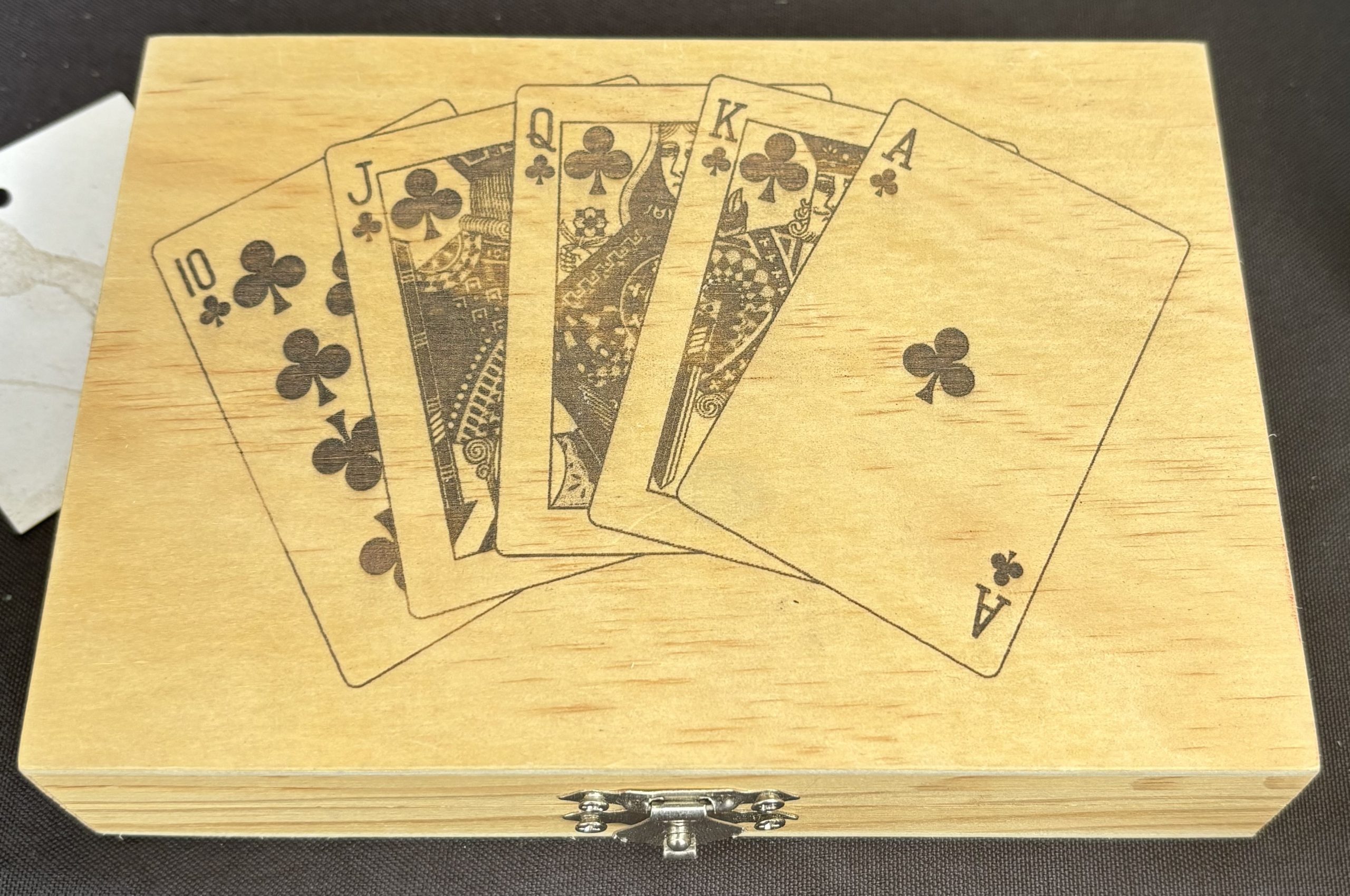 A flat rectangle box has a hinge, a silver shell-shaped latch, and two compartments inside for playing cards.