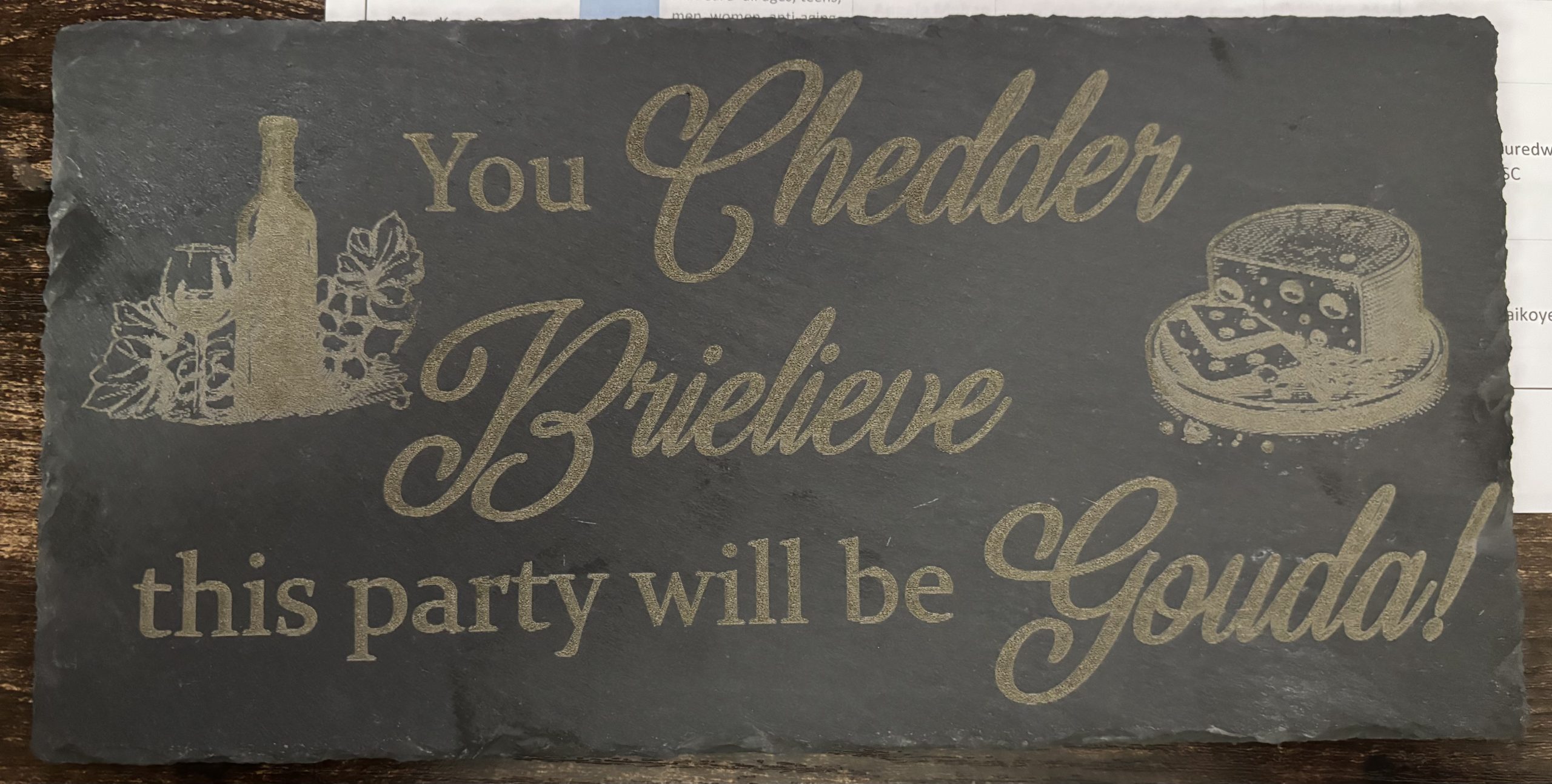 This slate sign delivers a fun, pun‑filled message that’s perfect for wine‑and‑cheese lovers who enjoy hosting with personality. The engraved lettering pops against the natural dark slate, paired with charming illustrations that add a stylish, handcrafted touch. Whether displayed in a kitchen, dining room, bar area, or party setup, it brings instant charm and a playful vibe to any gathering. A great gift for entertainers, foodies, or anyone who appreciates a good laugh served with their favorite snacks.
