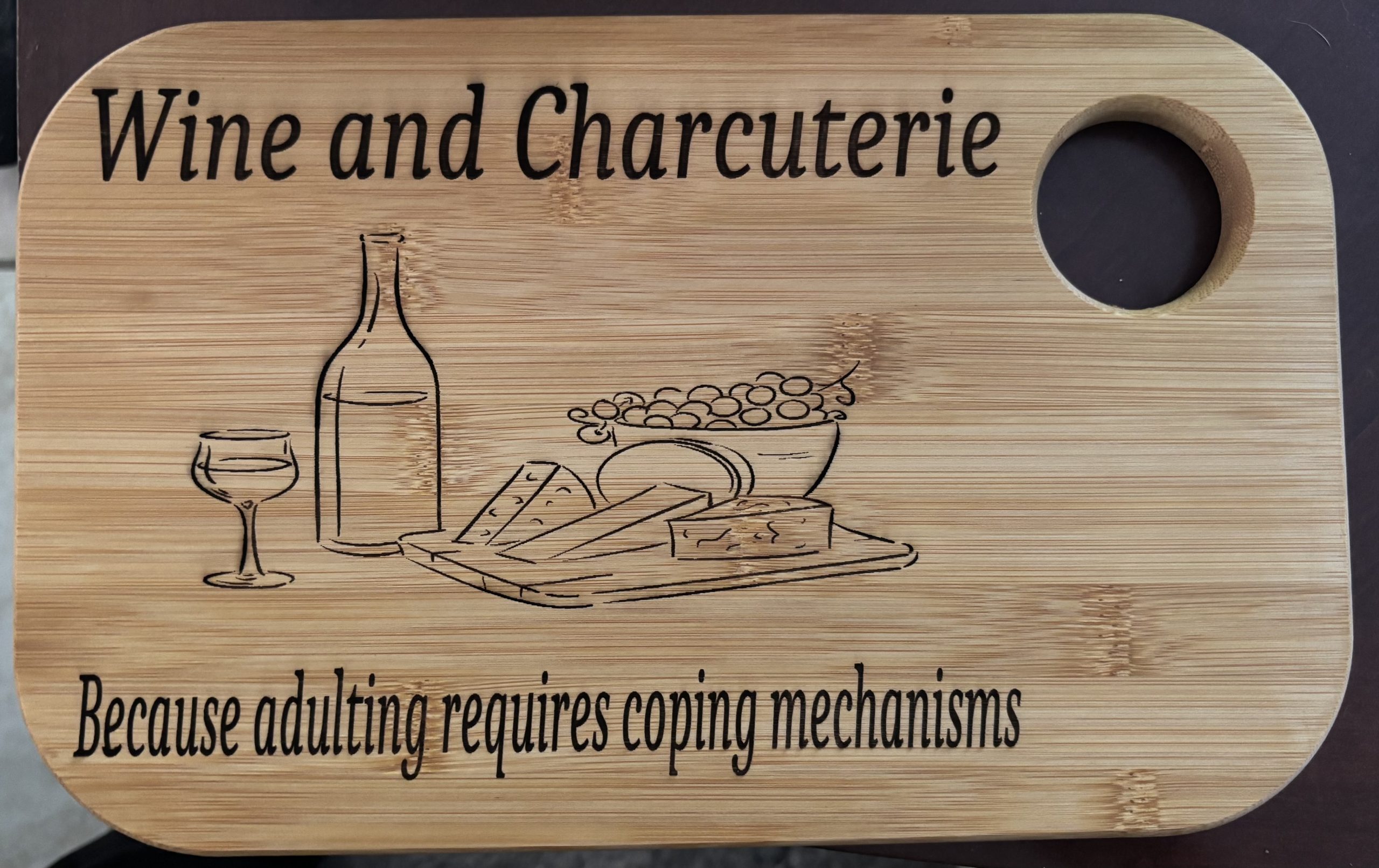 This wooden charcuterie board blends humor and style with its engraved “Wine and Charcuterie — Because adulting requires coping mechanisms” design. The detailed artwork of bottles, glasses, and grapes stands out beautifully against the natural wood grain, giving it a warm, handcrafted feel that elevates any gathering. Perfect for serving meats, cheeses, and snacks, it doubles as a fun décor piece that brings personality to kitchens, bars, and entertaining spaces. A great gift for wine lovers, party hosts, and anyone who appreciates a playful take on grown‑up life.