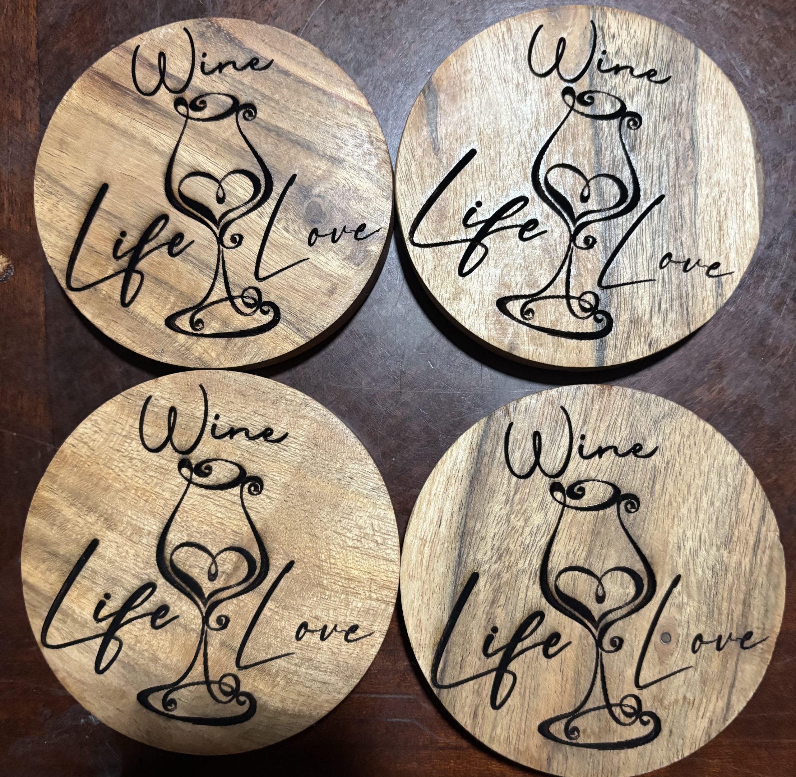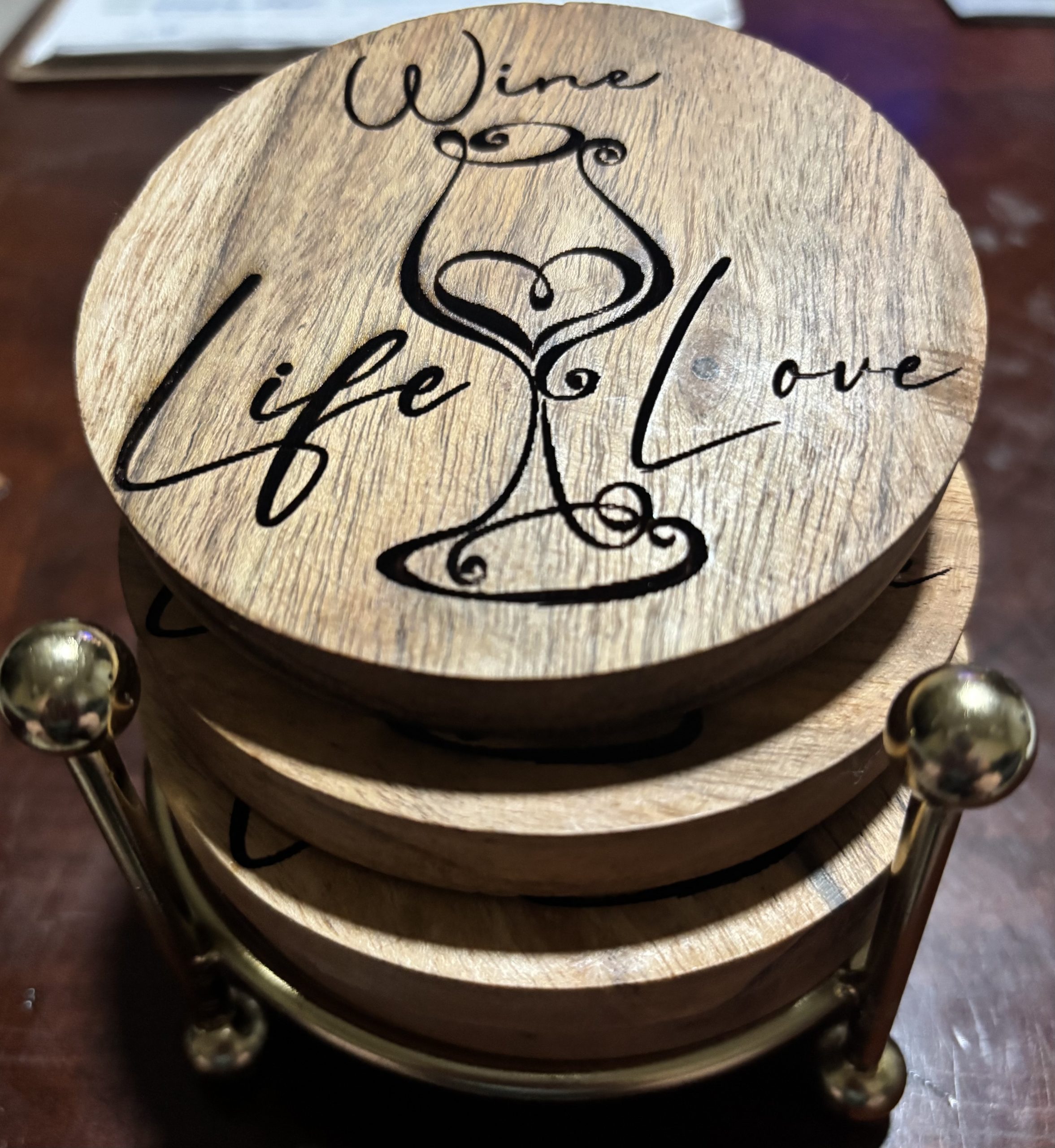 This set of wooden coasters brings warmth, charm, and a touch of elegance to any home with its beautifully engraved “Wine • Life • Love” design. The smooth, round coasters showcase rich natural wood grain, while the delicate wine‑glass artwork adds a stylish, celebratory feel. Nestled neatly in a gold‑tone metal holder, they’re both decorative and practical—perfect for protecting surfaces during gatherings, quiet evenings, or everyday use. A thoughtful gift for wine lovers, newlyweds, hosts, or anyone who appreciates handcrafted décor that blends beauty with function.