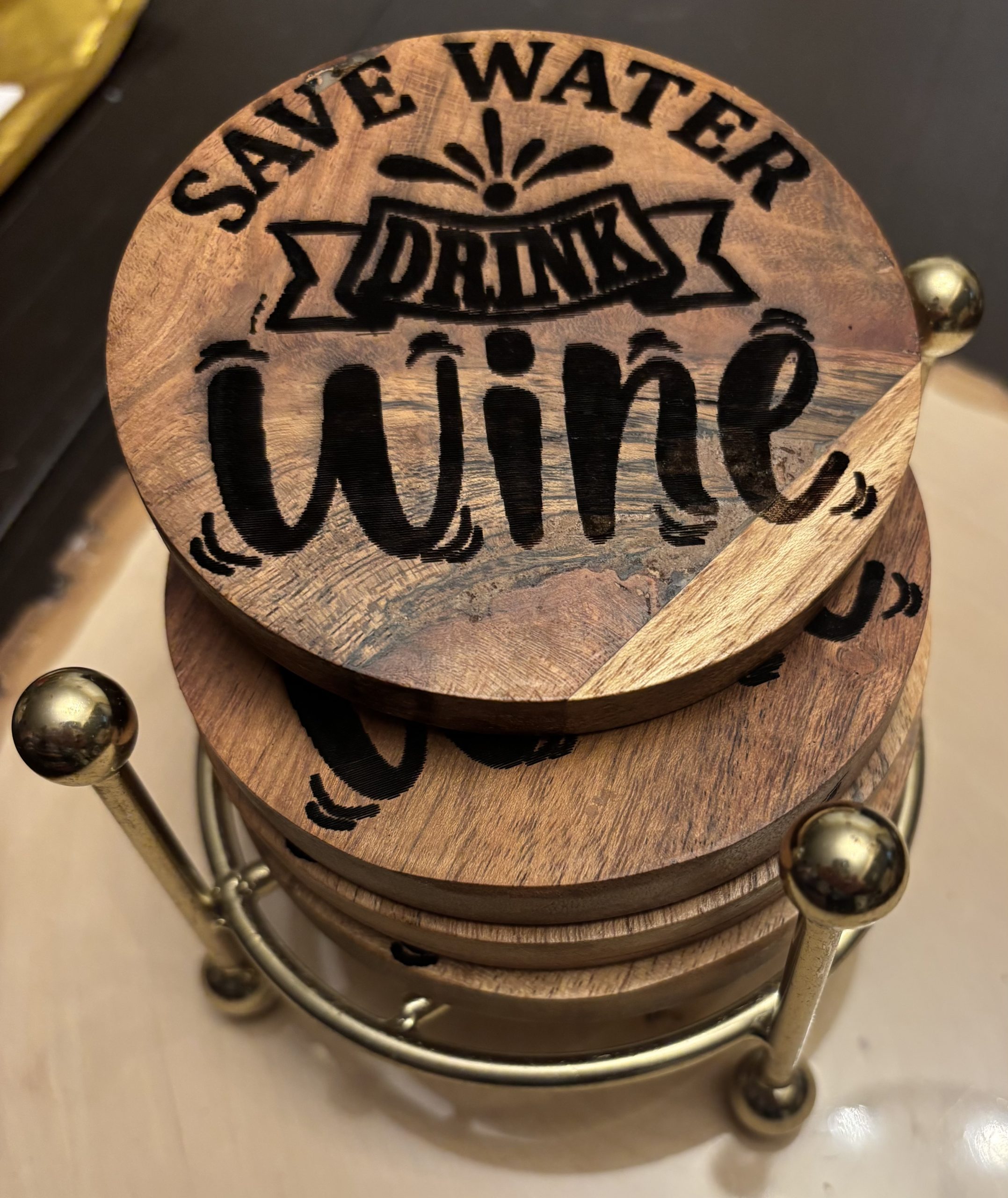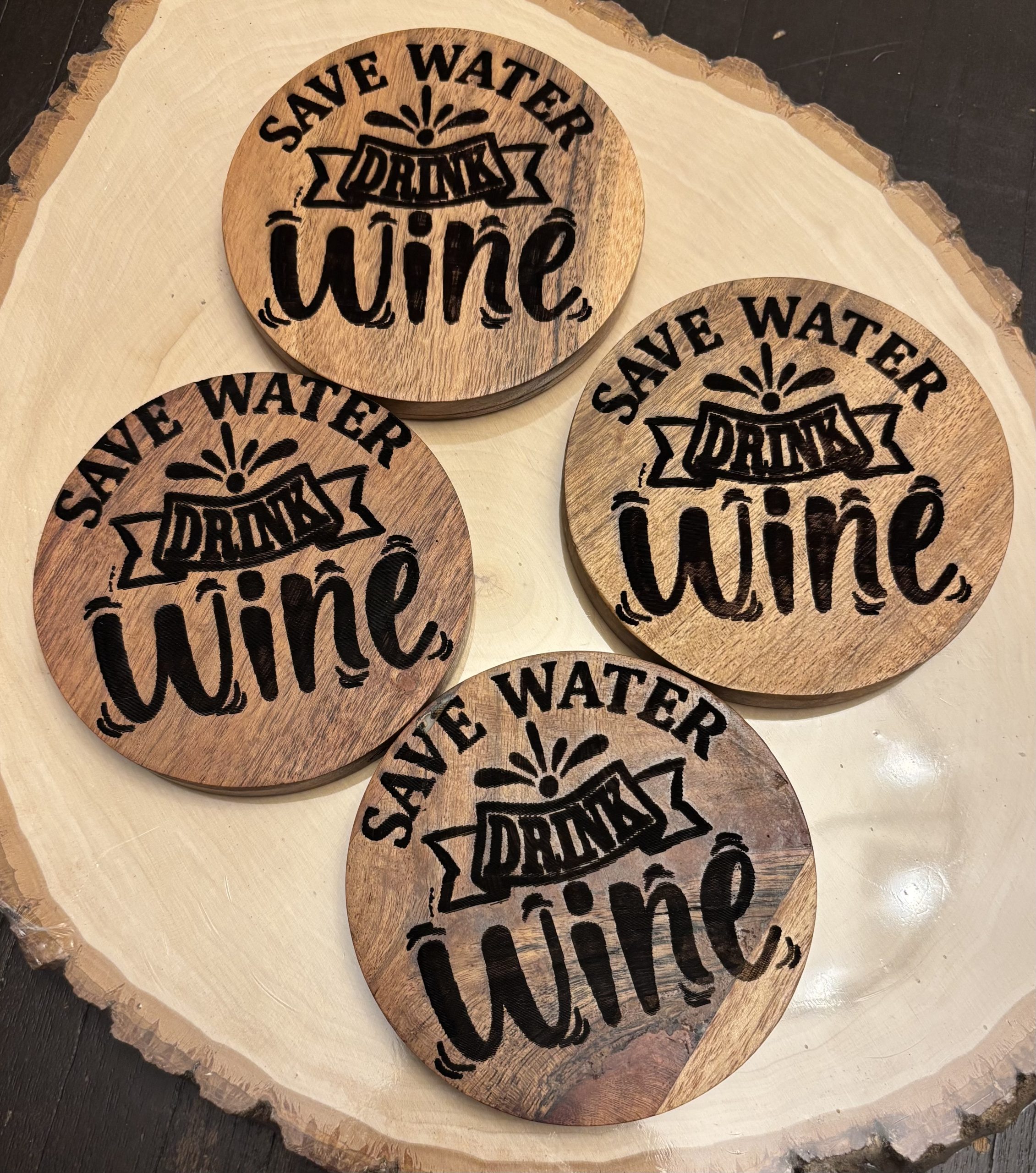 This set of wooden coasters brings warmth, charm, and a touch of elegance to any home with its beautifully engraved “Save Water Drink Wine” design. The smooth, round coasters showcase rich natural wood grain, while the delicate wine‑glass artwork adds a stylish, celebratory feel. Nestled neatly in a gold‑tone metal holder, they’re both decorative and practical—perfect for protecting surfaces during gatherings, quiet evenings, or everyday use. A thoughtful gift for wine lovers, newlyweds, hosts, or anyone who appreciates handcrafted décor that blends beauty with function.