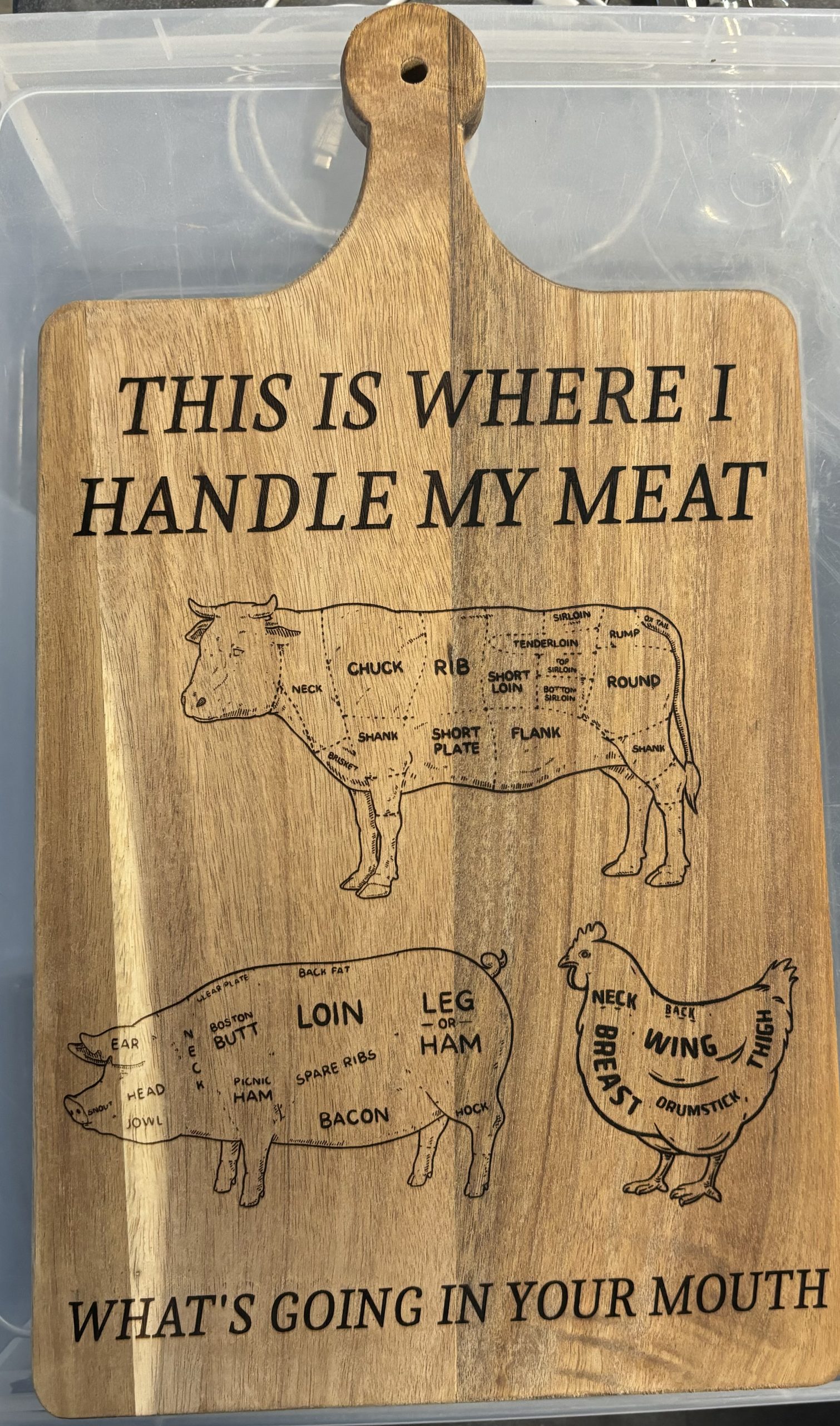 This wooden cutting board features a bold, humorous engraved design that’s perfect for anyone who loves to cook with personality. Detailed livestock diagrams add a rustic butcher‑shop vibe, while the playful phrases at the top and bottom bring a cheeky sense of humor to the kitchen with the saying this is where I handle my meat. The natural wood grain pairs beautifully with the crisp engraving, making it both a functional prep surface and a standout conversation piece. Ideal for grilling enthusiasts, home chefs, and anyone who appreciates a little sass with their seasoning, it also makes a memorable gift for birthdays, holidays, or housewarmings.