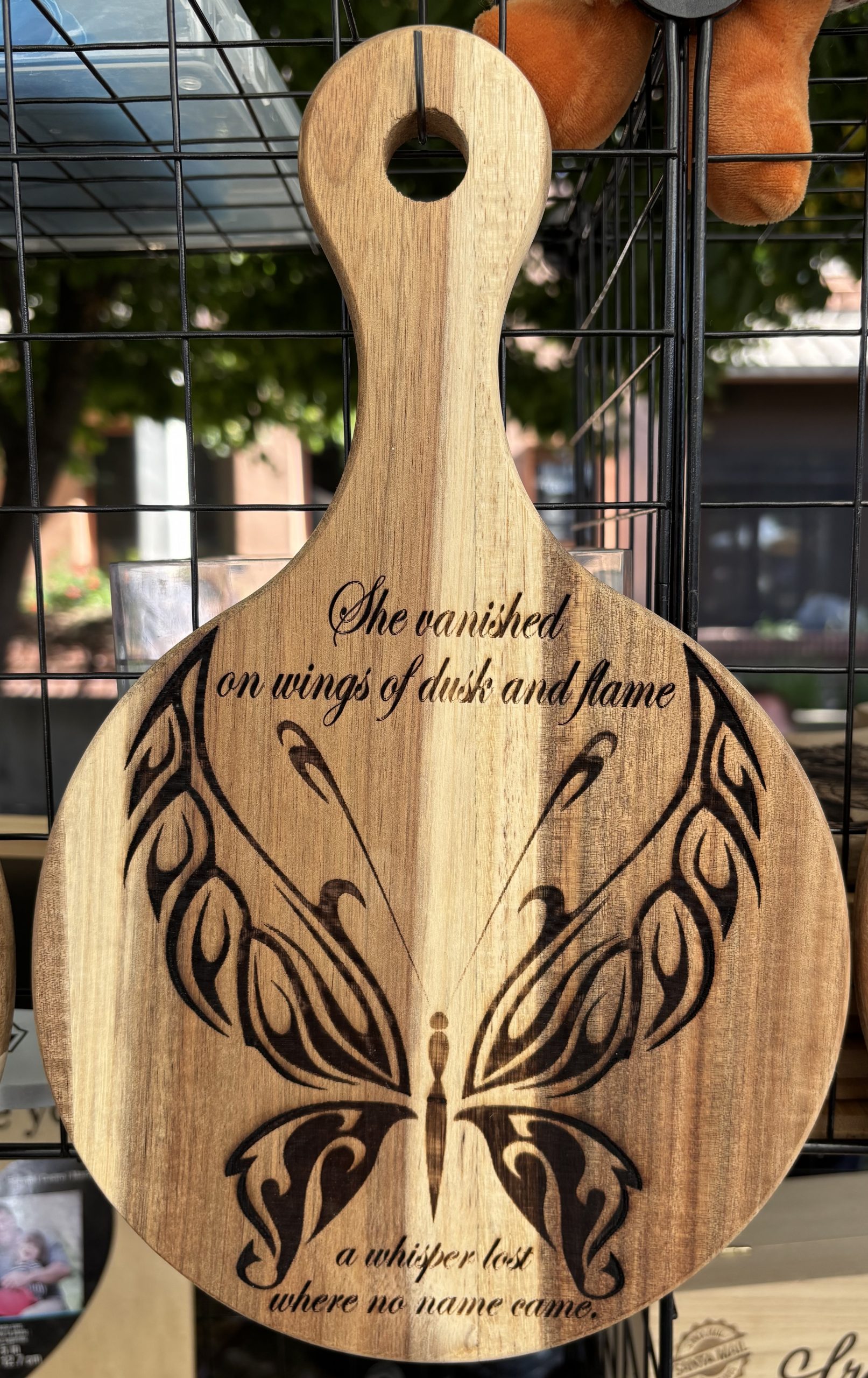 This wooden cutting board features a striking engraved butterfly paired with a poetic, mystical verse, creating a piece that feels both artistic and deeply expressive. The intricate wing patterns stand out beautifully against the natural wood grain, giving the board a handcrafted, gallery‑worthy presence. Whether used for light kitchen prep, displayed as wall décor, or gifted to someone who appreciates symbolic or fantasy‑inspired art, it brings a sense of mystery, elegance, and storytelling to any space. A thoughtful choice for nature lovers, writers, dreamers, and anyone drawn to meaningful design.