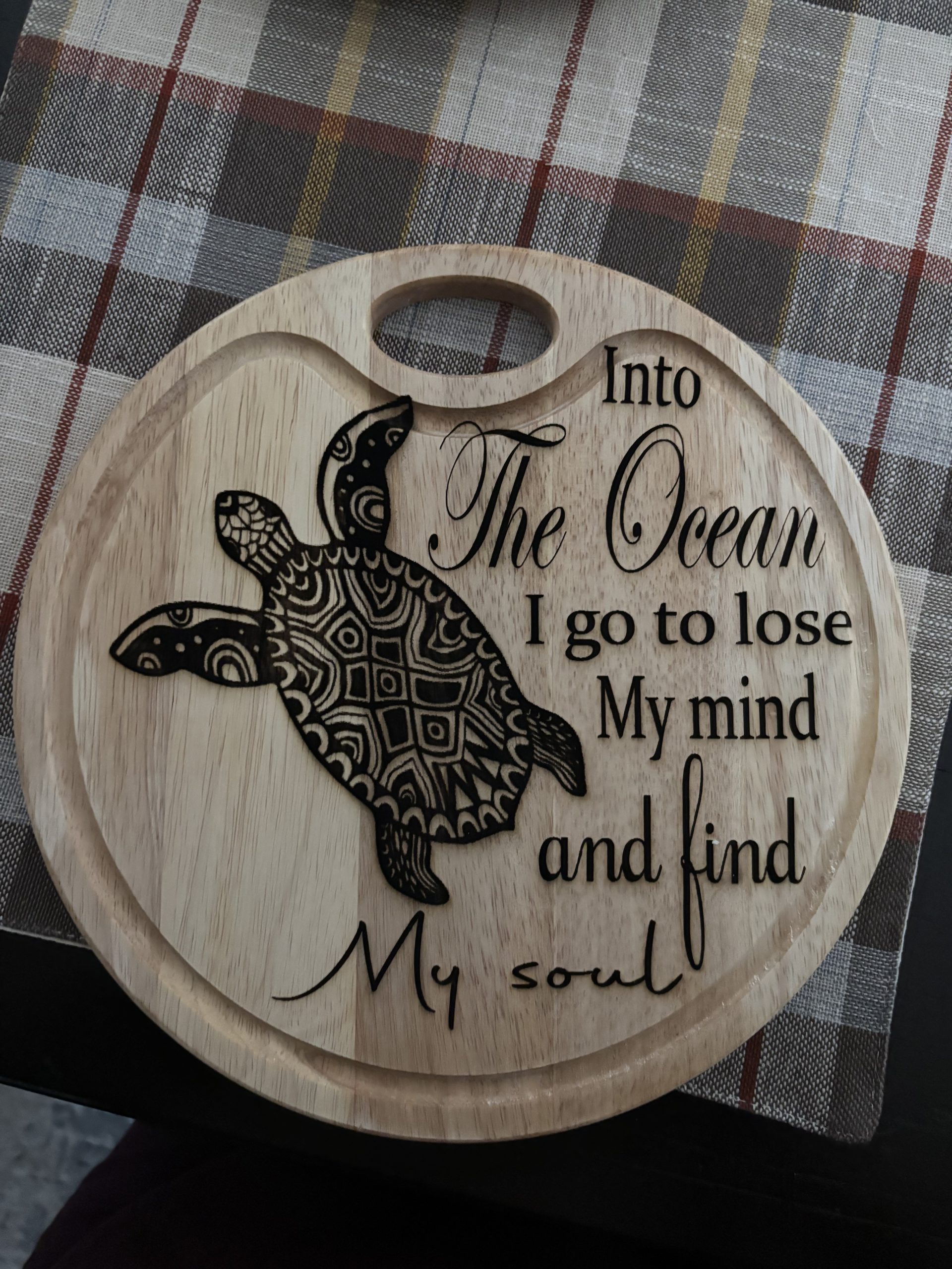 This wooden cutting board features a beautifully engraved sea turtle surrounded by an inspiring quote about finding peace and clarity in the ocean. The intricate artwork stands out against the natural wood grain, giving the piece a warm, handcrafted feel that works as both functional kitchenware and meaningful décor. Perfect for ocean lovers, beach‑themed homes, or anyone who feels connected to the sea, it makes a thoughtful gift for birthdays, housewarmings, or special occasions. Elegant, uplifting, and full of coastal charm, it’s a piece that brings a sense of calm to any space.