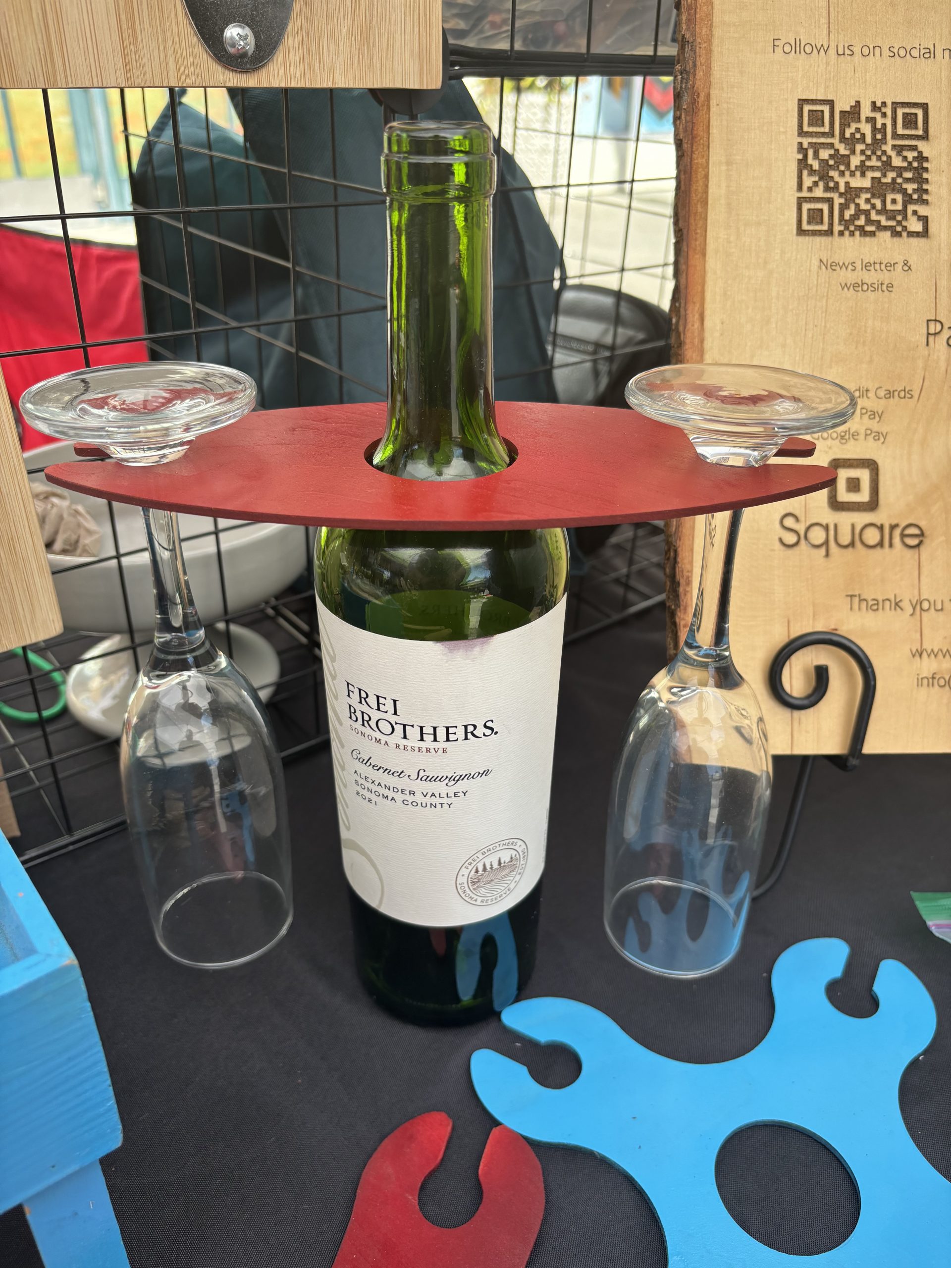 Turn any bottle of wine into a beautiful display with this handcrafted wooden glass holder. Designed to rest securely on the neck of a standard wine bottle, it holds four stemmed glasses in perfect balance, creating a striking centerpiece for kitchens, bars, and gift baskets.