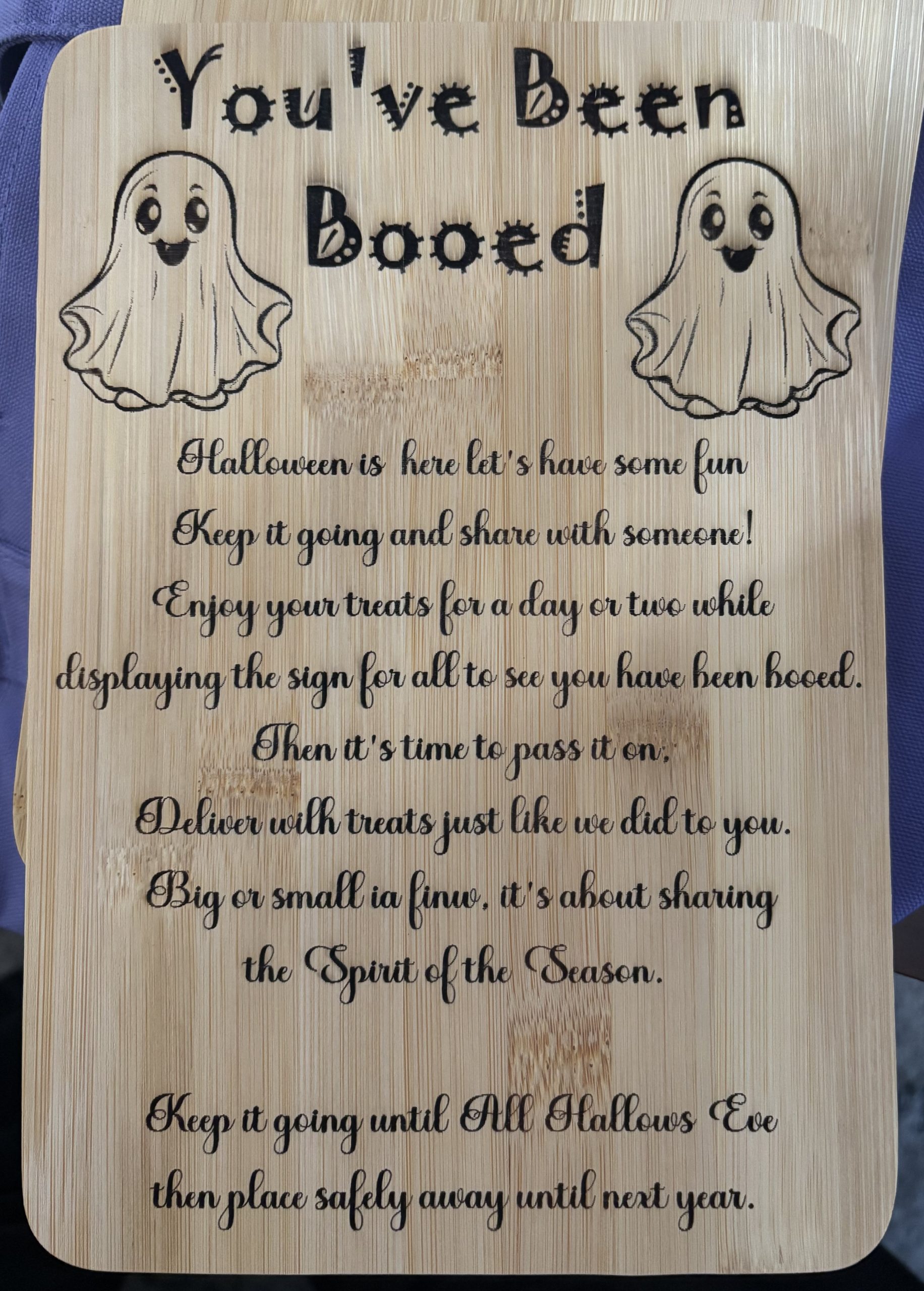 This wooden sign brings Halloween fun to life with its engraved “You’ve Been Booed” poem and adorable ghost illustrations. The detailed design stands out against the natural wood grain, creating a warm, handcrafted piece perfect for front doors, porches, classrooms, offices, or neighborhood gift‑drop traditions. It’s a charming way to spread seasonal cheer, encourage community connection, and keep the spooky‑sweet spirit of Halloween going all October long. A thoughtful addition to fall décor and a delightful keepsake families can reuse year after year.