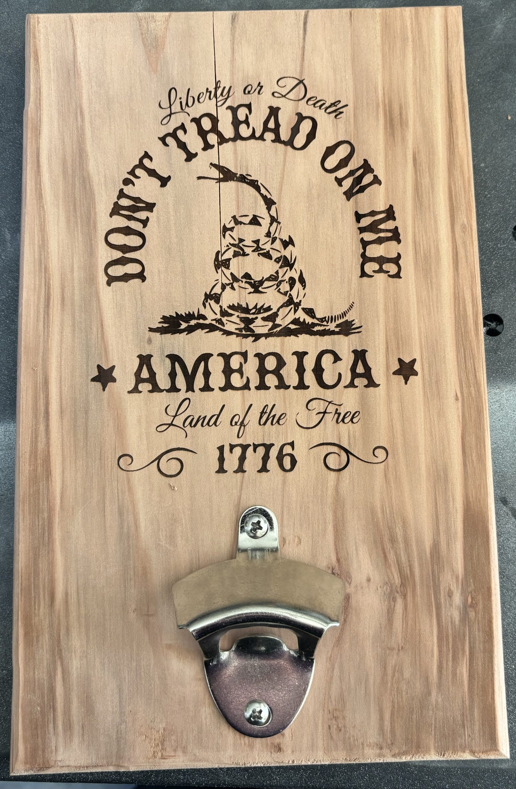 A rectangular Redwood plaque features Don’t tread on me engraved prominently across its surface. Mounted near the bottom is a sturdy metal bottle opener, giving the piece both decorative appeal and everyday usefulness. The combination of natural wood grain, bold engraving, and functional hardware creates a rugged, accent piece perfect for a bar area, game room, or man cave.