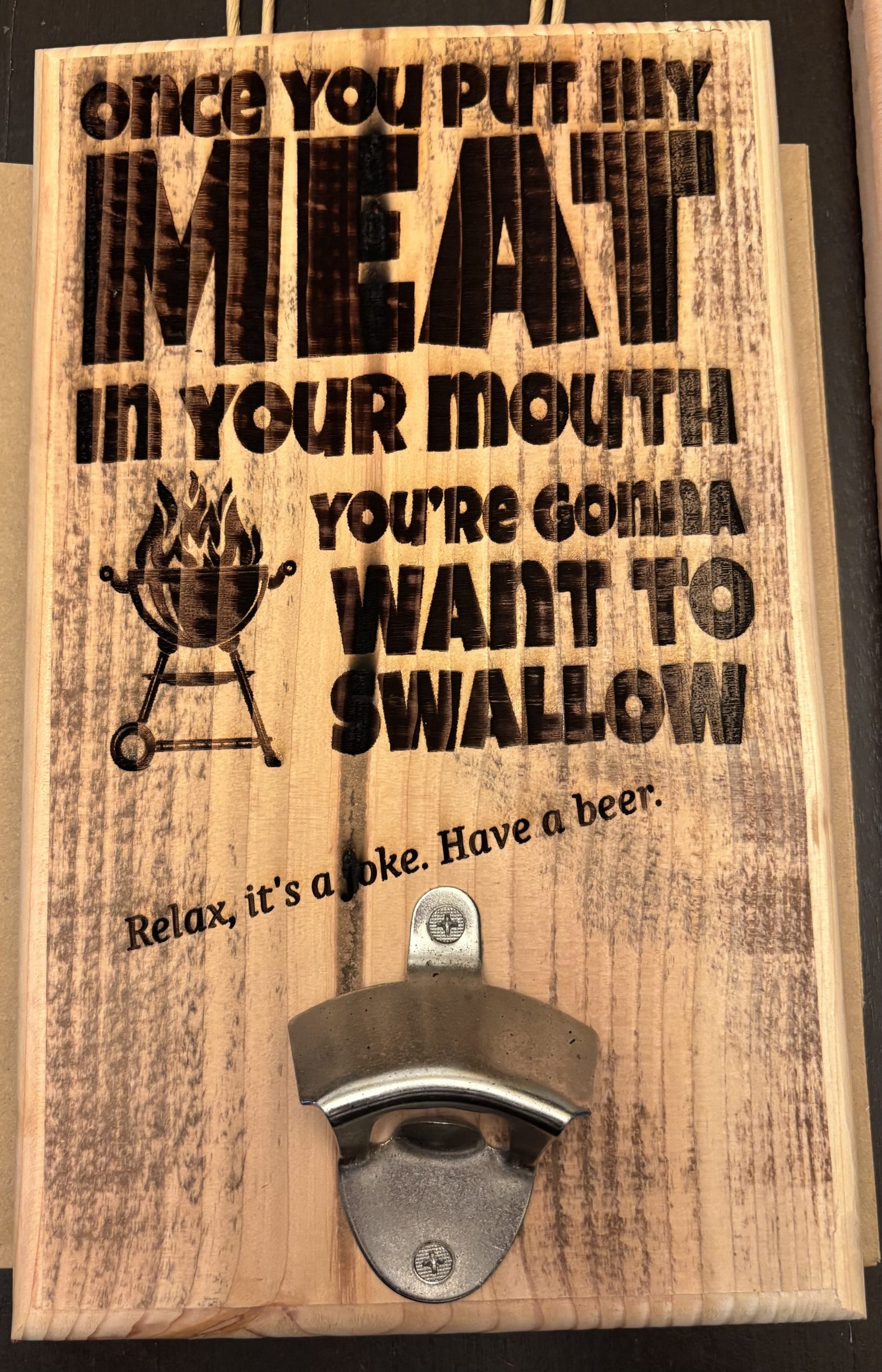 A rectangular Redwood plaque features some bbq humor with the saying Once you put my meat in your mouth, you’re gonna want to swallow. Relax, it’s a joke. Have a beer. engraved prominently across its surface. Mounted near the bottom is a sturdy metal bottle opener, giving the piece both decorative appeal and everyday usefulness. The combination of natural wood grain, bold engraving, and functional hardware creates a rugged, accent piece perfect for a bar area, game room, or man cave.