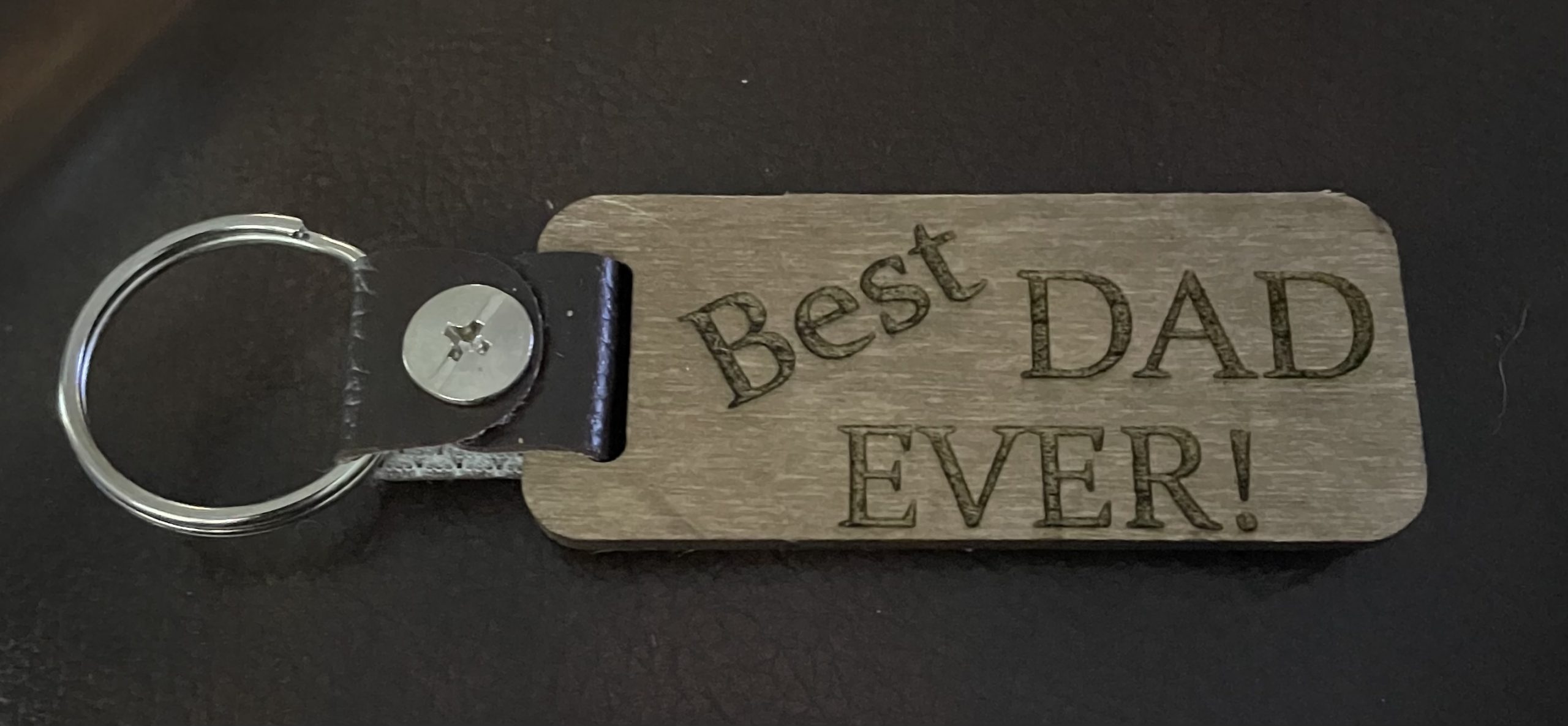 Features a rectangular shape with rounded corners and attached to a metal ring with a faux leather strip.