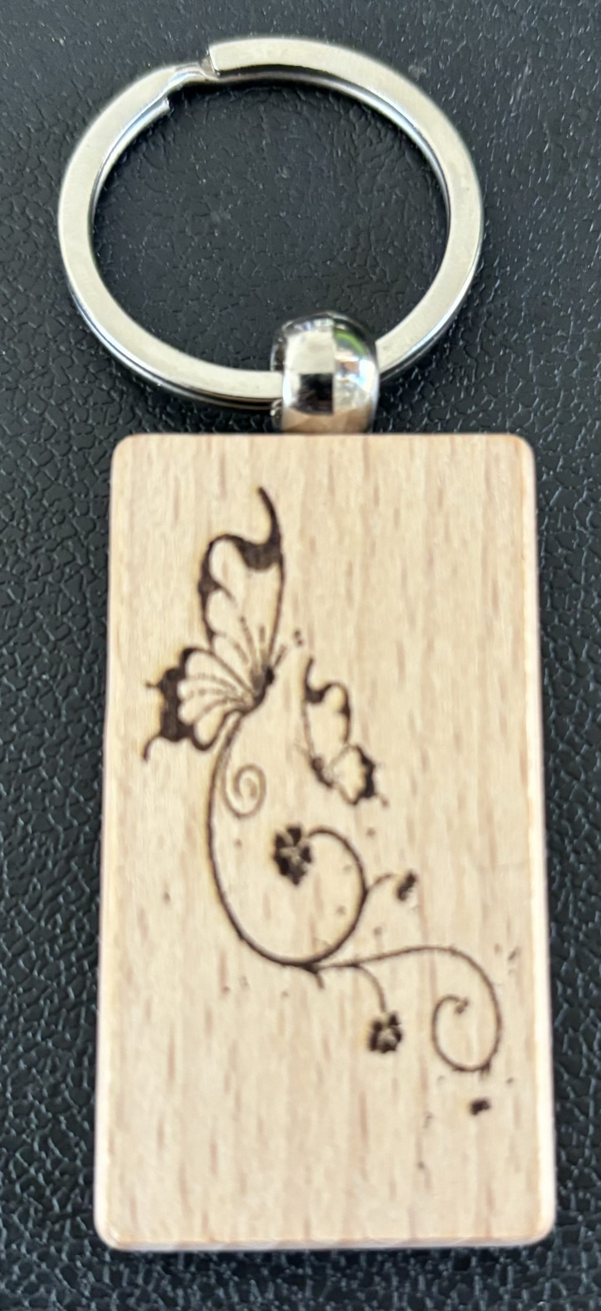 This Beech wood keychain features a crisp, engraved butterfly design. The natural wood grain gives each piece its own character, while the sturdy metal ring makes it easy to attach to keys, bags, or gear. Cute, lightweight, and durable — a perfect everyday accessory or gift.
