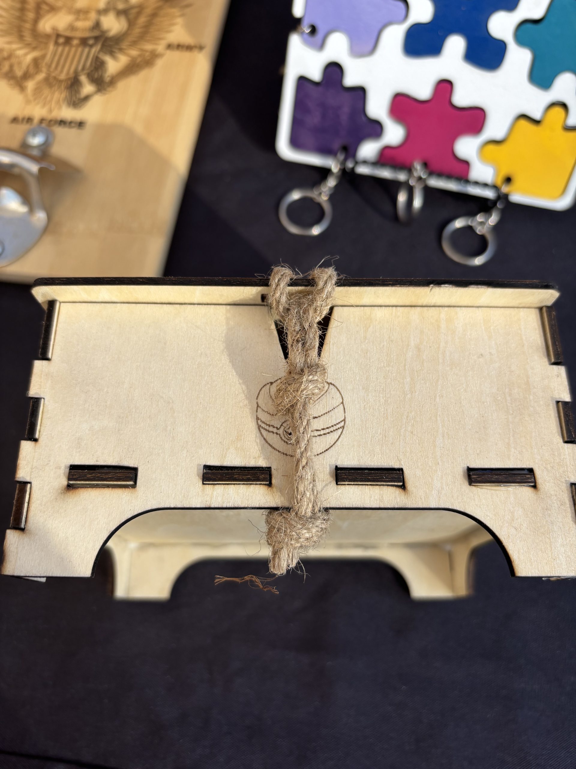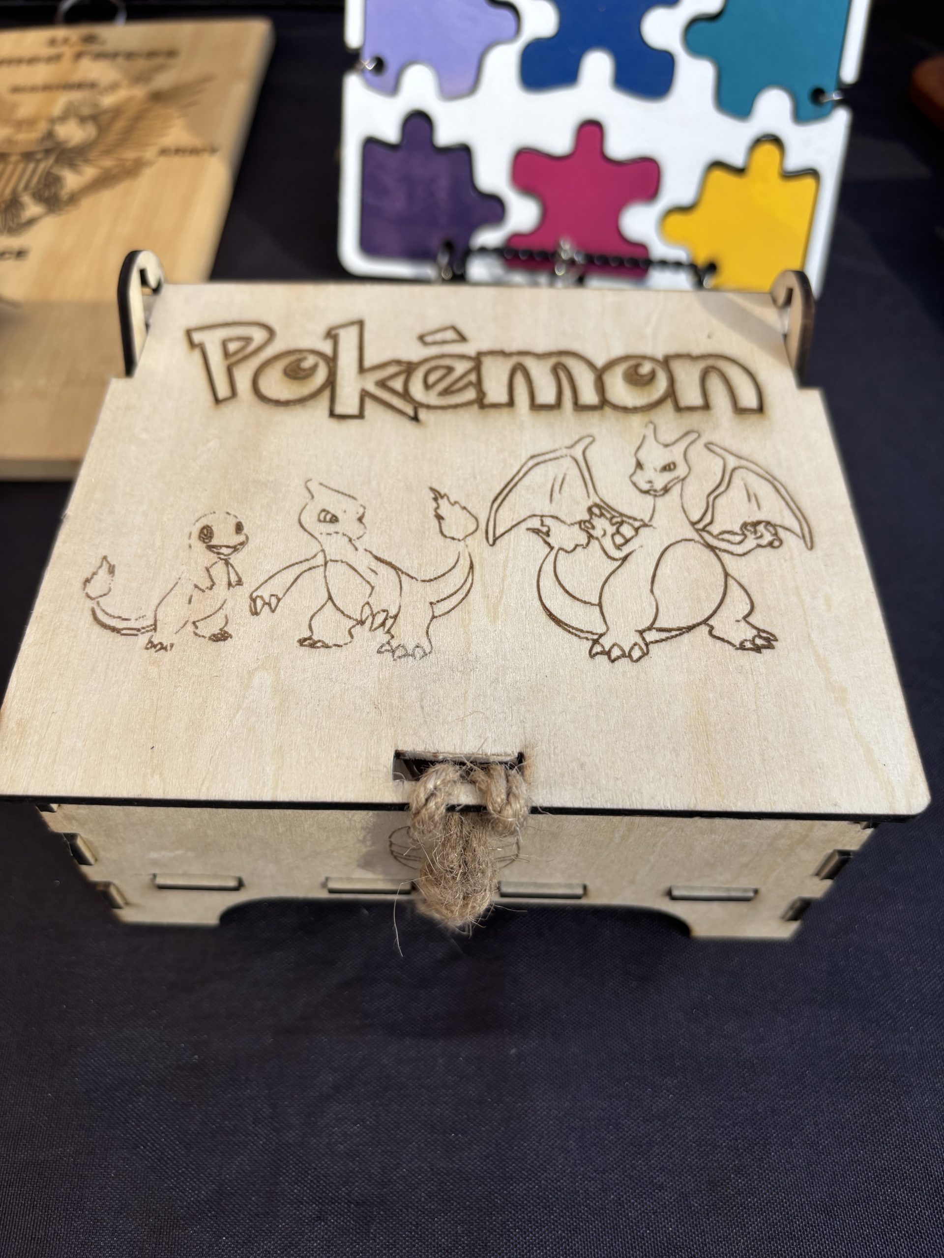 Celebrate your love for classic creatures with this beautifully crafted wooden Pokémon‑themed box. Each panel is precision‑engraved with iconic character silhouettes and elemental symbols, creating a striking blend of nostalgia and artistry. The interlocking construction gives it a sturdy, handcrafted feel, while the rope loop adds a practical touch for hanging or carrying.
