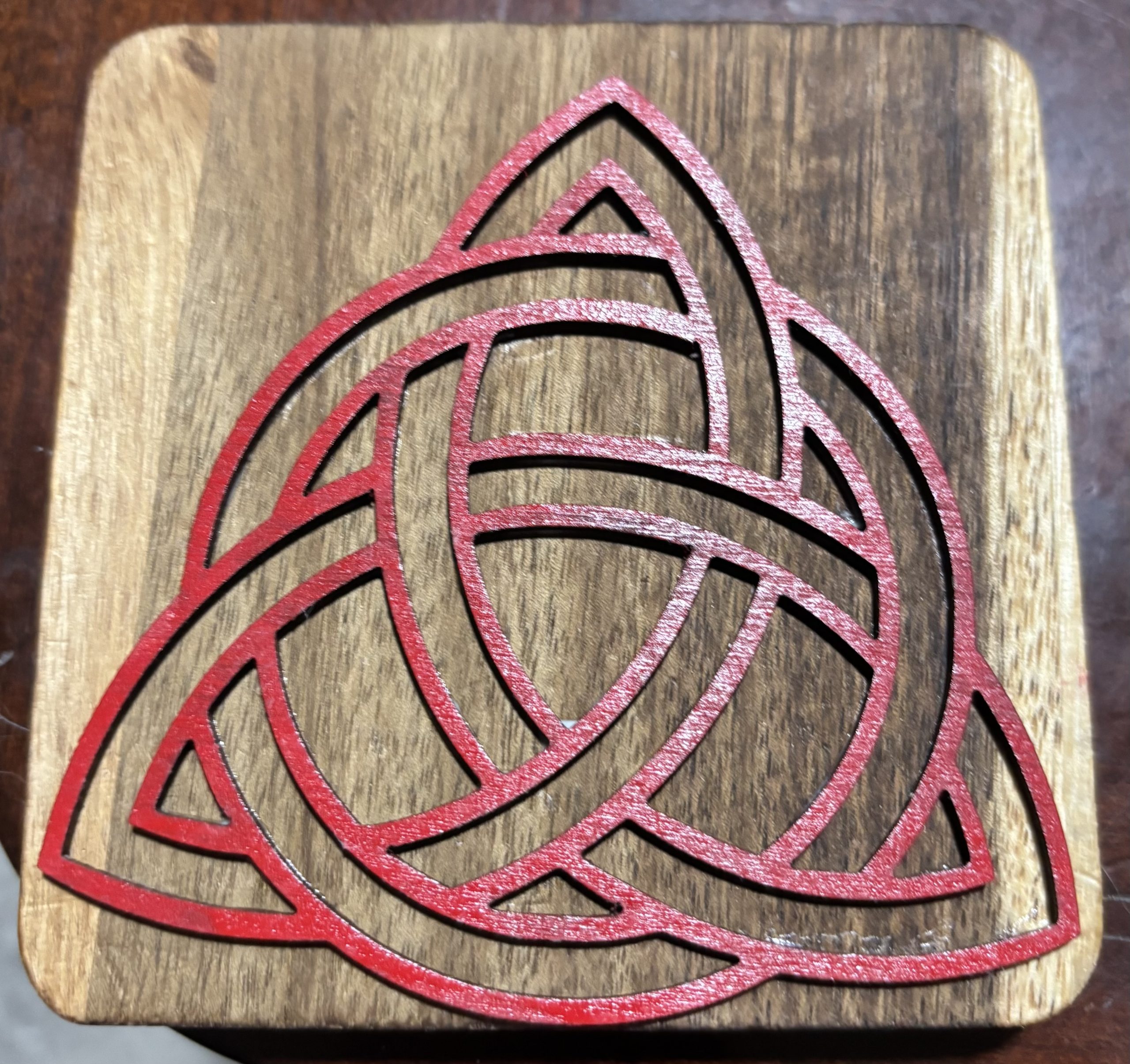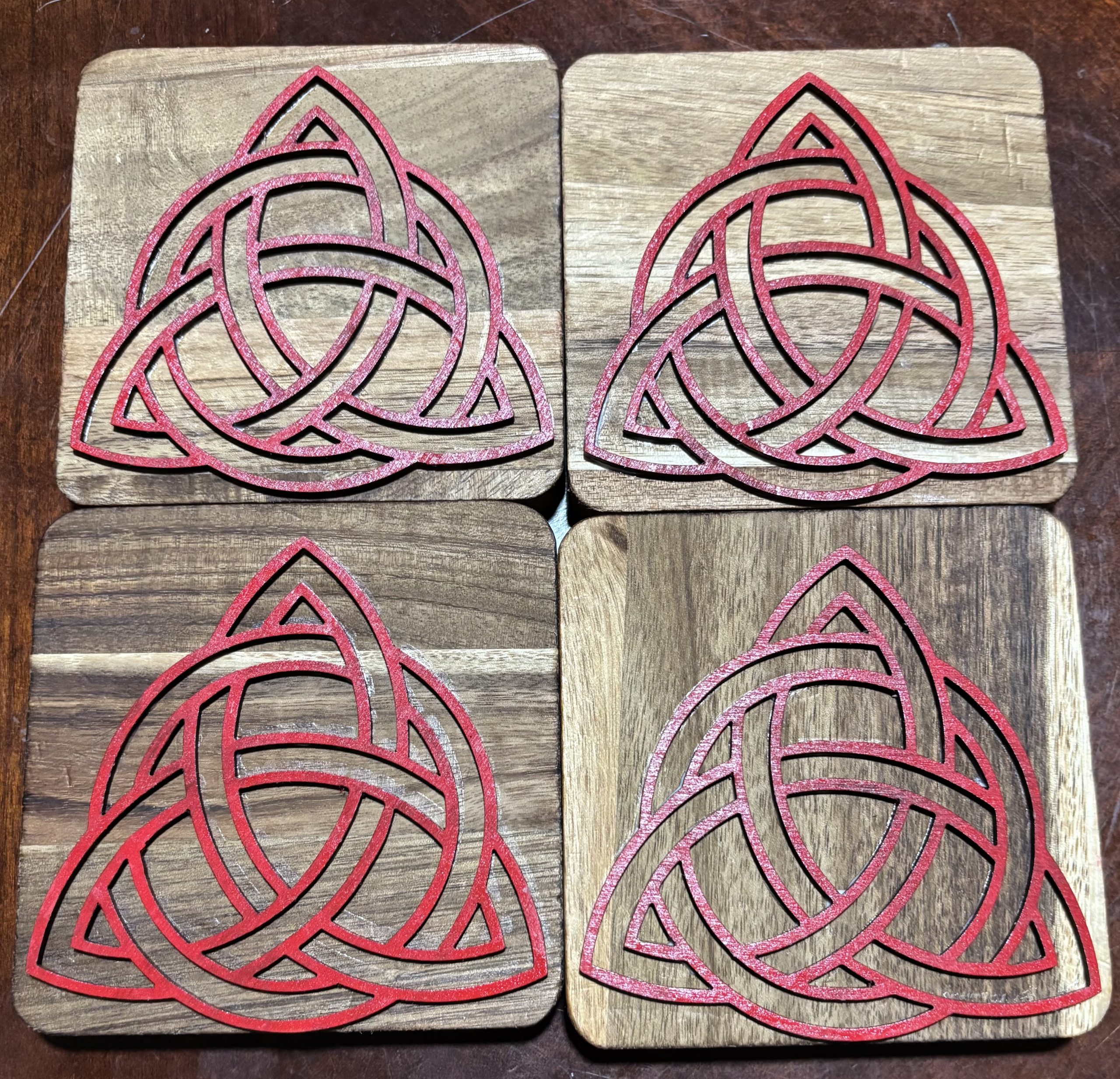 Add timeless symbolism and bold artistry to your table with this handcrafted set of wooden coasters. Each piece features an intricately laser-cut triquetra — a classic Celtic knot representing unity, eternity, and interconnectedness — set against natural wood grain for a beautiful contrast. The crisp lines and rich color make these coasters both functional and decorative.