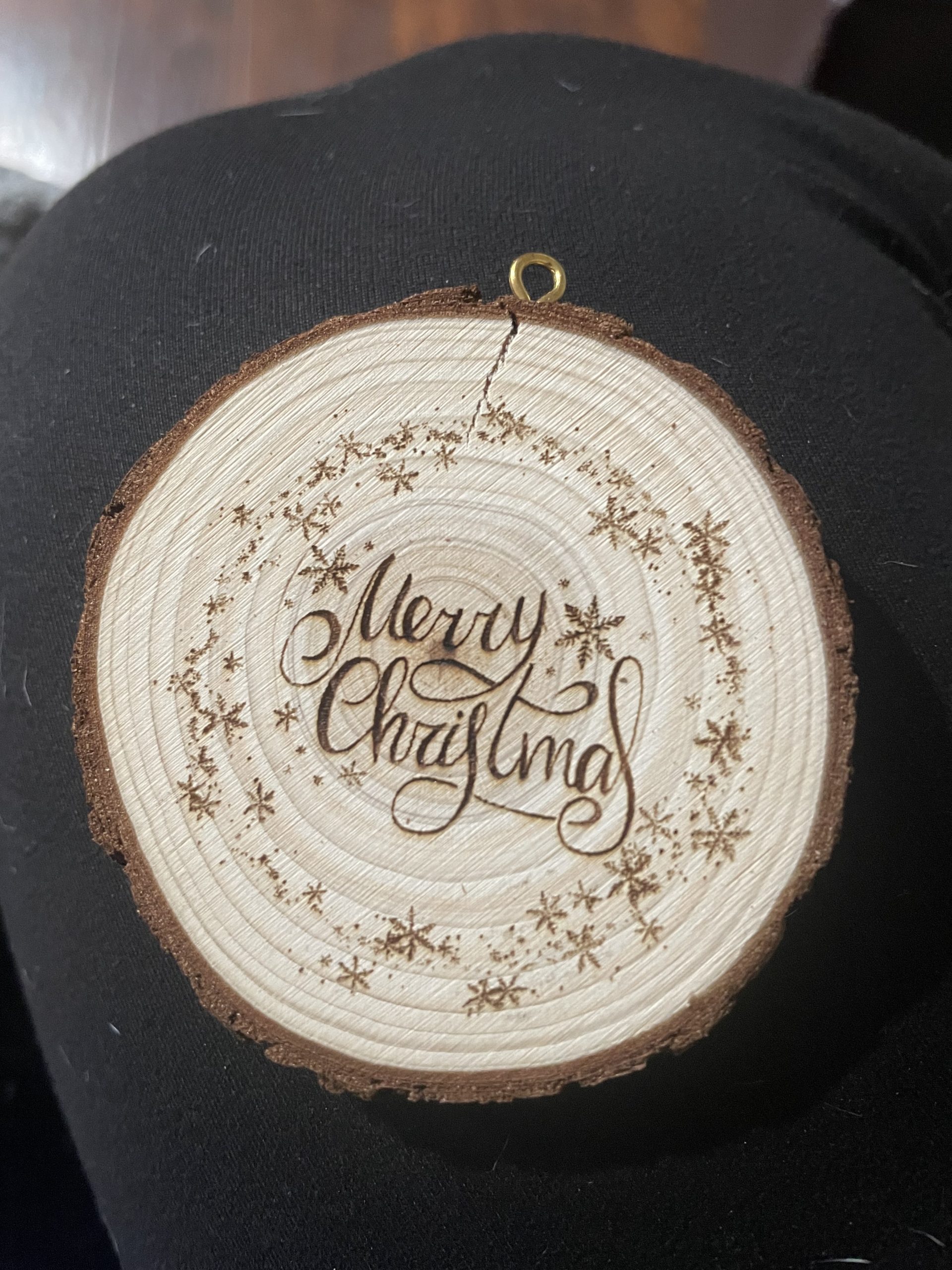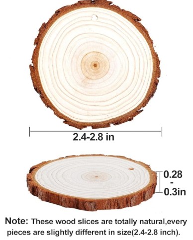 Made of natural Fir trees, it’s approx. 2.4-2.8 inches in diameter and 0.28-0.3 inches thick. Each slice was sanded and polished.
