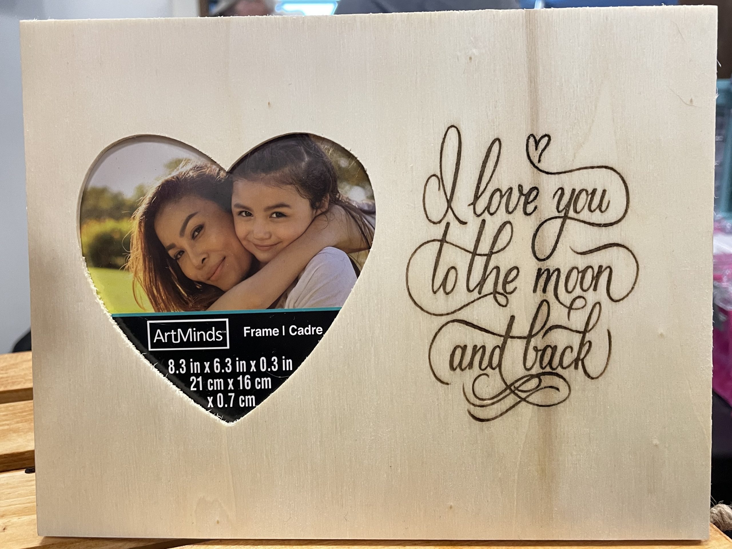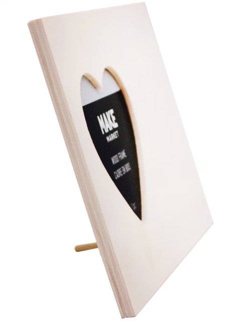 Plywood frame features a heart-shaped photo opening.