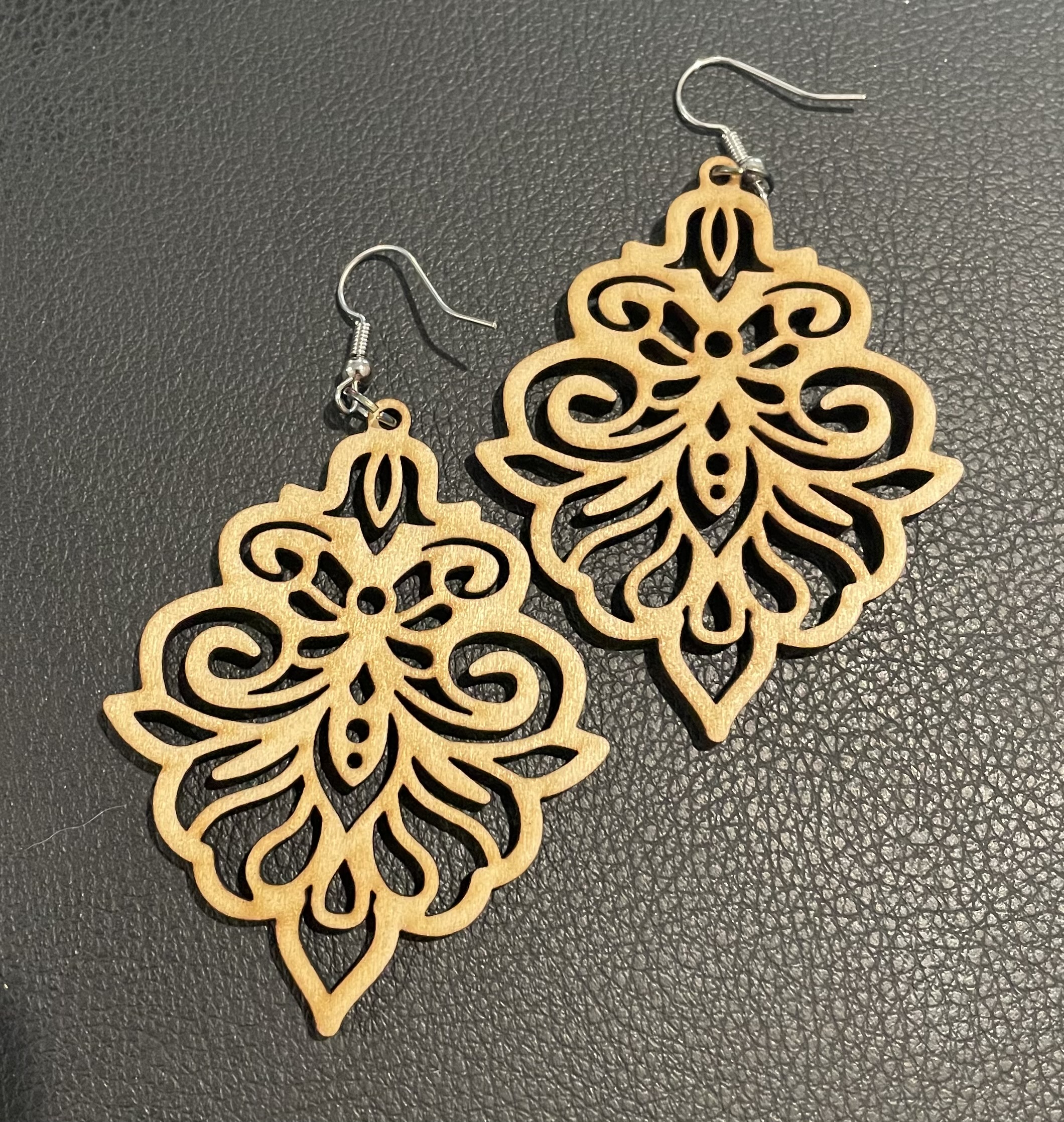 Delicate, detailed, and beautifully handcrafted earrings feature intricate scrollwork carved into natural wood. The symmetrical pattern creates a lace‑like effect that feels both classic and artistic, giving the earrings a lightweight, airy elegance. Their refined design makes them perfect for everyday wear or special occasions.