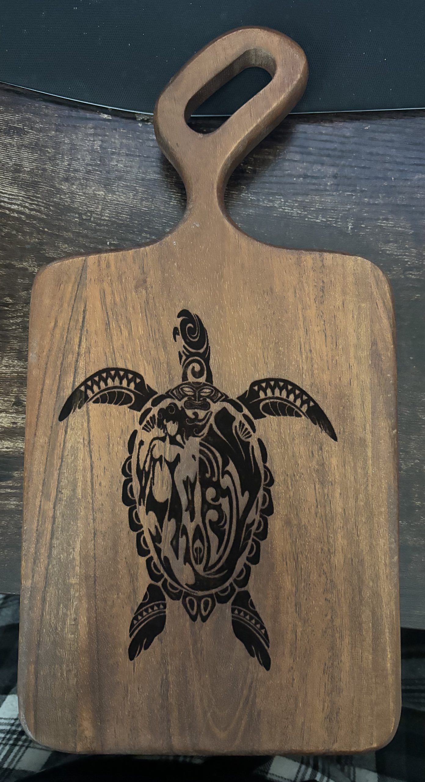 Bring a splash of island artistry into your kitchen. This wooden cutting board features a beautifully engraved tribal‑style sea turtle, turning a practical tool into a display‑worthy piece. The rich wood grain pairs perfectly with the bold black engraving, giving it a warm, coastal vibe that stands out on any counter.