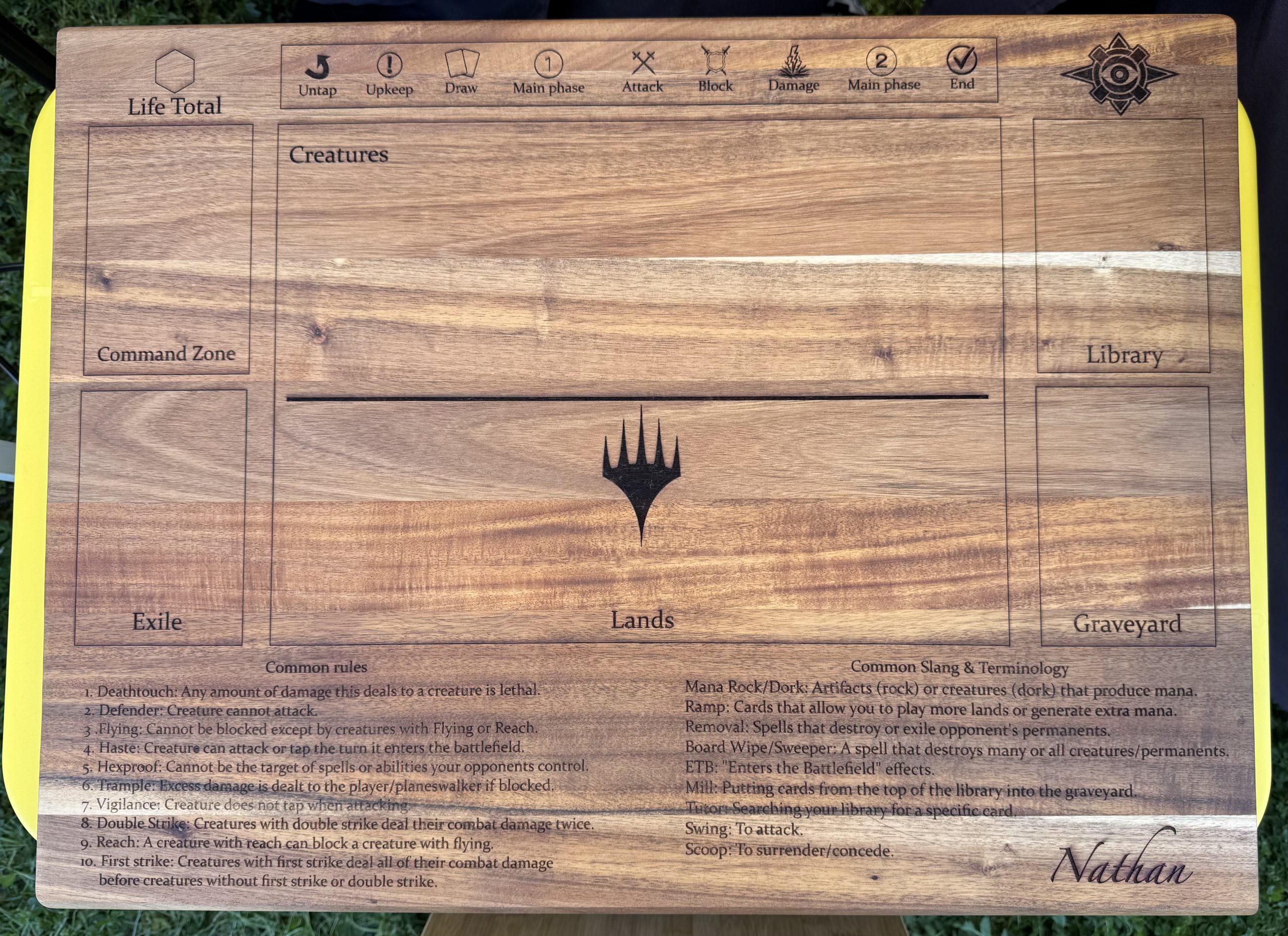 A full list of common MTG keywords is engraved along the side for quick reference, making it perfect for new players and seasoned commanders alike. The bamboo surface is smooth, durable, and visually striking, turning your play area into a centerpiece.